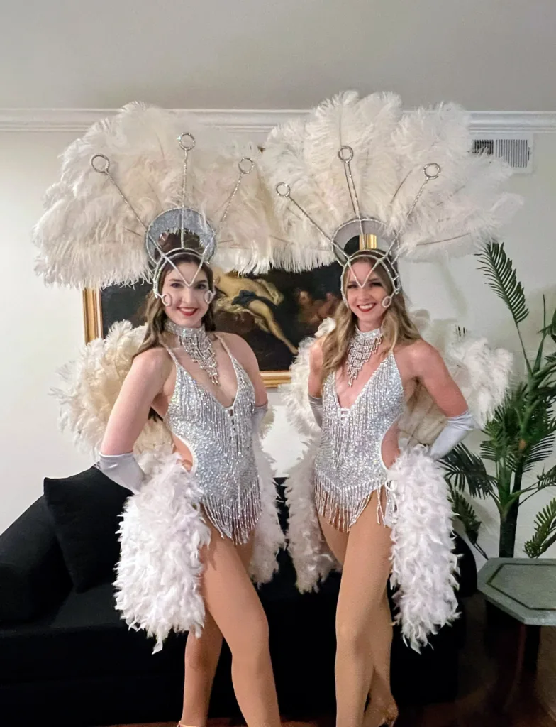 We headed to Studio City this week to help a local company celebrate a major milestone: their five-year anniversary. To mark the occasion with some serious flair, we brought in a duo of showgirls in our classic white Vegas-style costumes, towering ostrich plumes, sparkling sequins, and all.