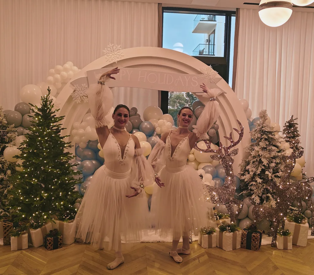 The highlight of the event was a breathtaking duet performed by two of our professional ballerinas. Against a backdrop of holiday décor, their synchronized movement captured the ethereal spirit of the season. Following the performance, the dancers transitioned into live improvisation and greeting, engaging with guests and adding a layer of living artistry to the festive atmosphere.