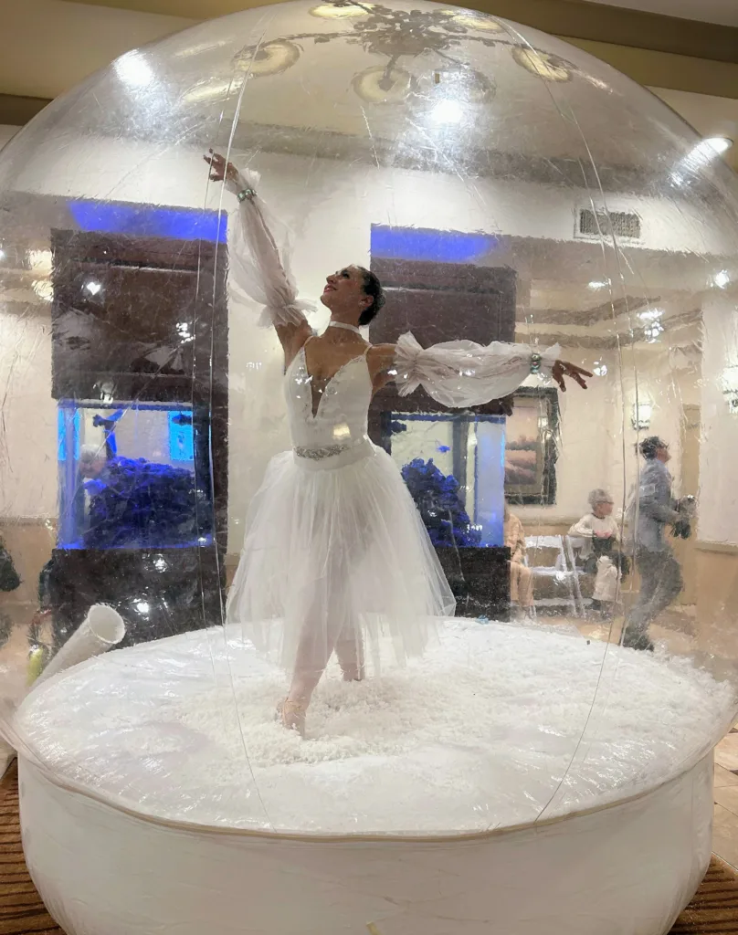 In a high-end corporate setting, the goal is often to create a visual that feels both grand and effortless. Our dancer provided a continuous flow of classical movement as guests mingled, creating a living centerpiece that anchored the room’s decor. The combination of the swirling snow and the sharp, elegant lines of the ballet provided a sophisticated backdrop that felt much more like a curated art installation than a standard holiday performance.